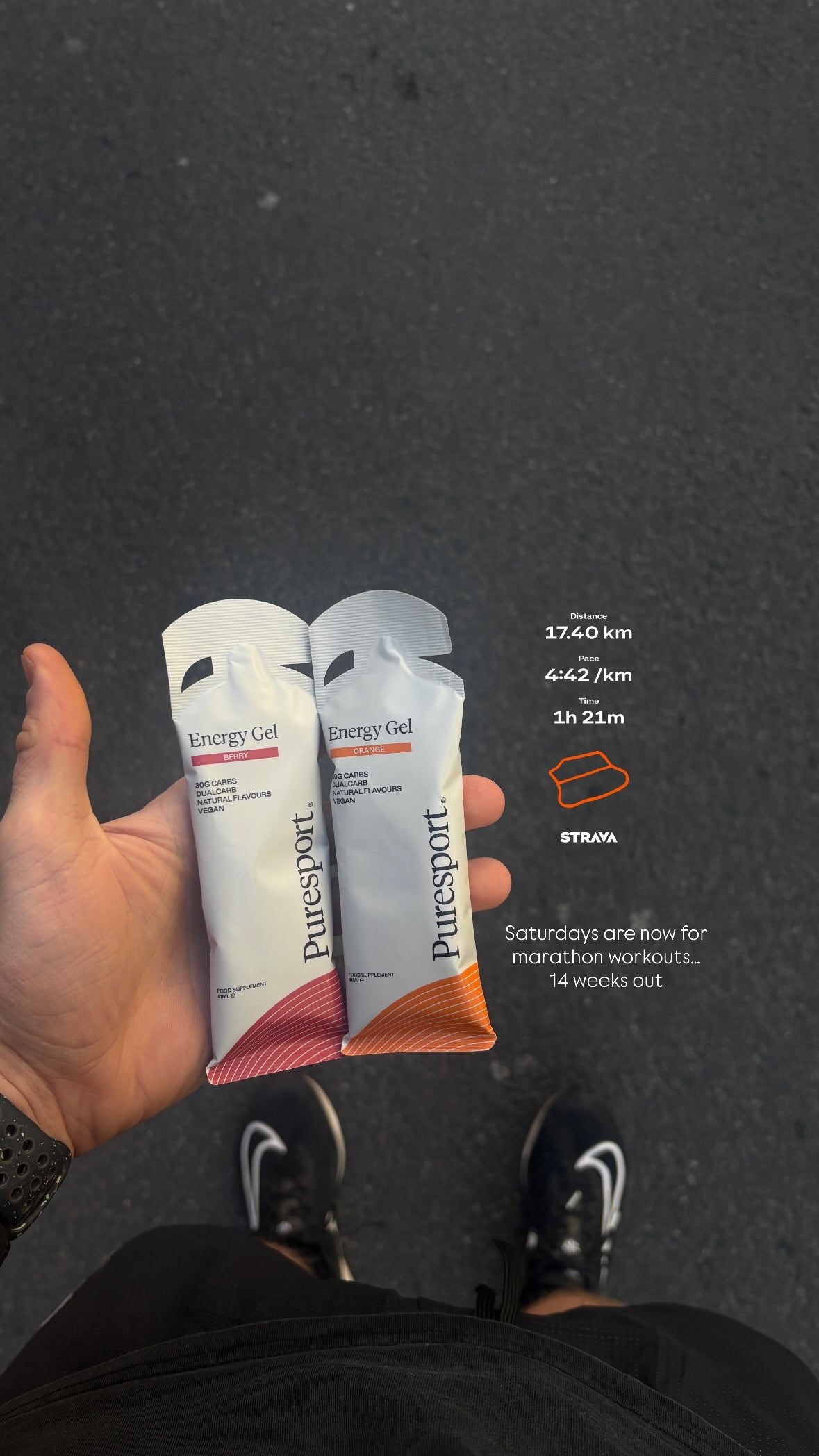 Most runners perform best fuelling at~60 g/hour. One Puresport Gel every 30 minutes keeps energy steady, delays fatigue, and speeds up recovery between sessions.